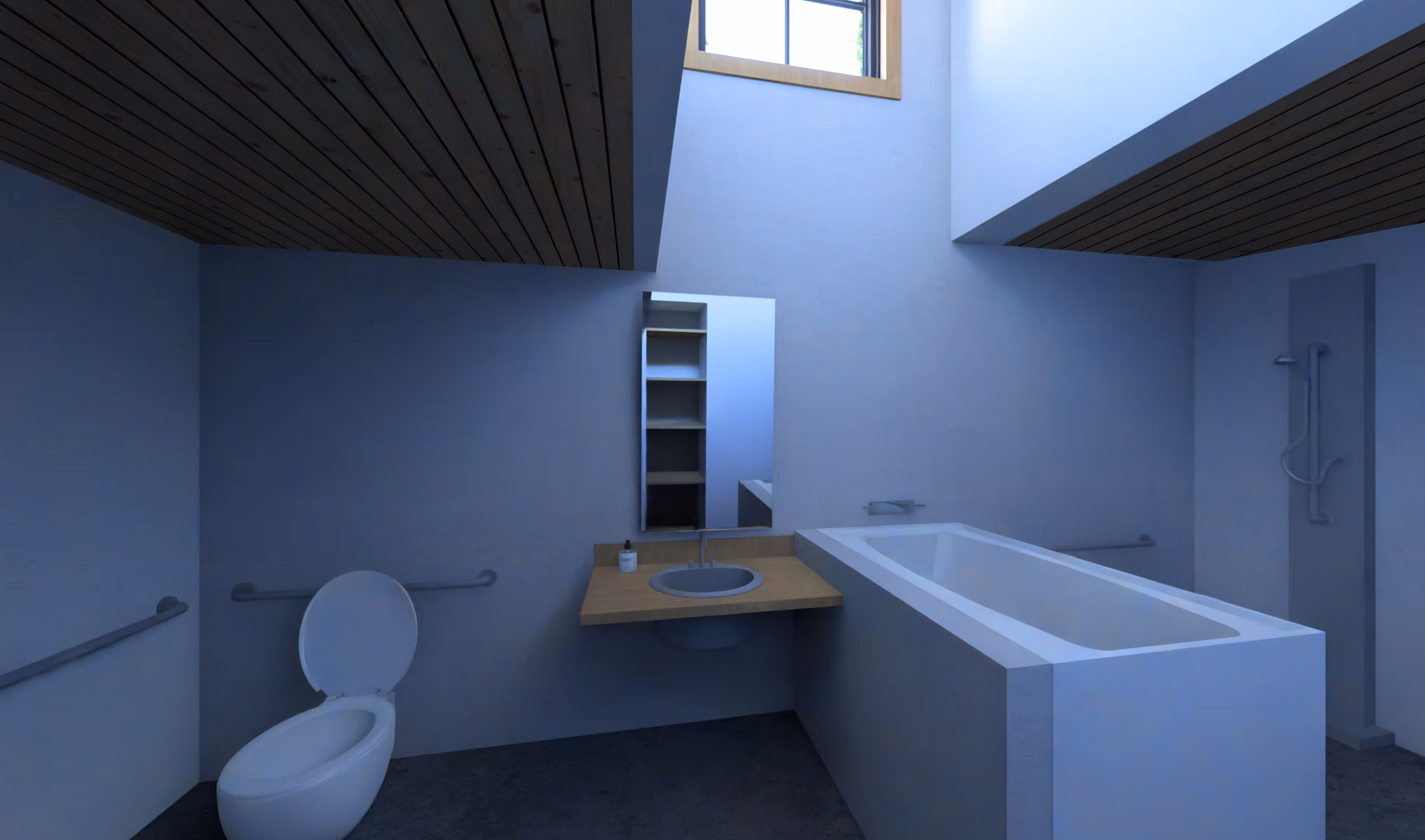 There is a convenience lavatory/sink in the bedroom as well – this is just that, convenience. Especially for care-givers convenience in having rapid access to a sink and faucet in the bedroom for drinking or cleanup needs. Like the kitchen sink and faucet, an additional control is included here to manage the low amounts of irrigation the indoor green roofs in both spaces will require – which will also assist in dust control on those horizontal out of reach areas, and the green roofs will help to moderate air contaminants, oxygen levels, and humidity levels, not to mention provide a biophilic psychological benefit.