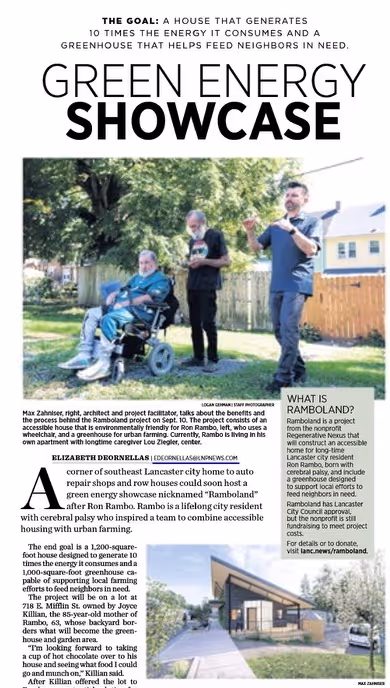 Ron Rambo may be responsible for more curb cuts%2C,surface%20of%20an%20adjoining%20street.) and ramps getting added in the City of Lancaster than any other human. As a necessary user himself, Ron has not stopped at attempting to improve his own access, but has been an activist and advocate on behalf of all folks with differing mobilities. That said, most American cities, because ADA is structured in such a way that grandfathers many business, city systems, and buildings into pre-ADA requirements and features, it is still very hard to get around even public areas for many citizens. We have found that many folks, even social and environmental activists, are unaware of this, thinking “that’s no longer an issue, ADA fixed that a long time ago.” In fact, as important as ADA was, it took some of the wind out of the larger movement advocating for progress in these areas, and we must continue to innovate, expanding access in not only economically and environmentally sustainable ways, but in ways that allow more of us to thrive together, in all ways, including economically. Ramboland is proving this is possible, in part by changing the scale and expanding the types of systems we combine. The synergies among energy, water, food, conveyance and mobility, and policy and financial systems are huge, but only if we can look at things differently than we’re accustomed to. Ramboland will cost less to build than Ron will need in subsistence benefits from the state, and it will self-sustain and self-expand financially. What if this was the default for how we address these things all at once.